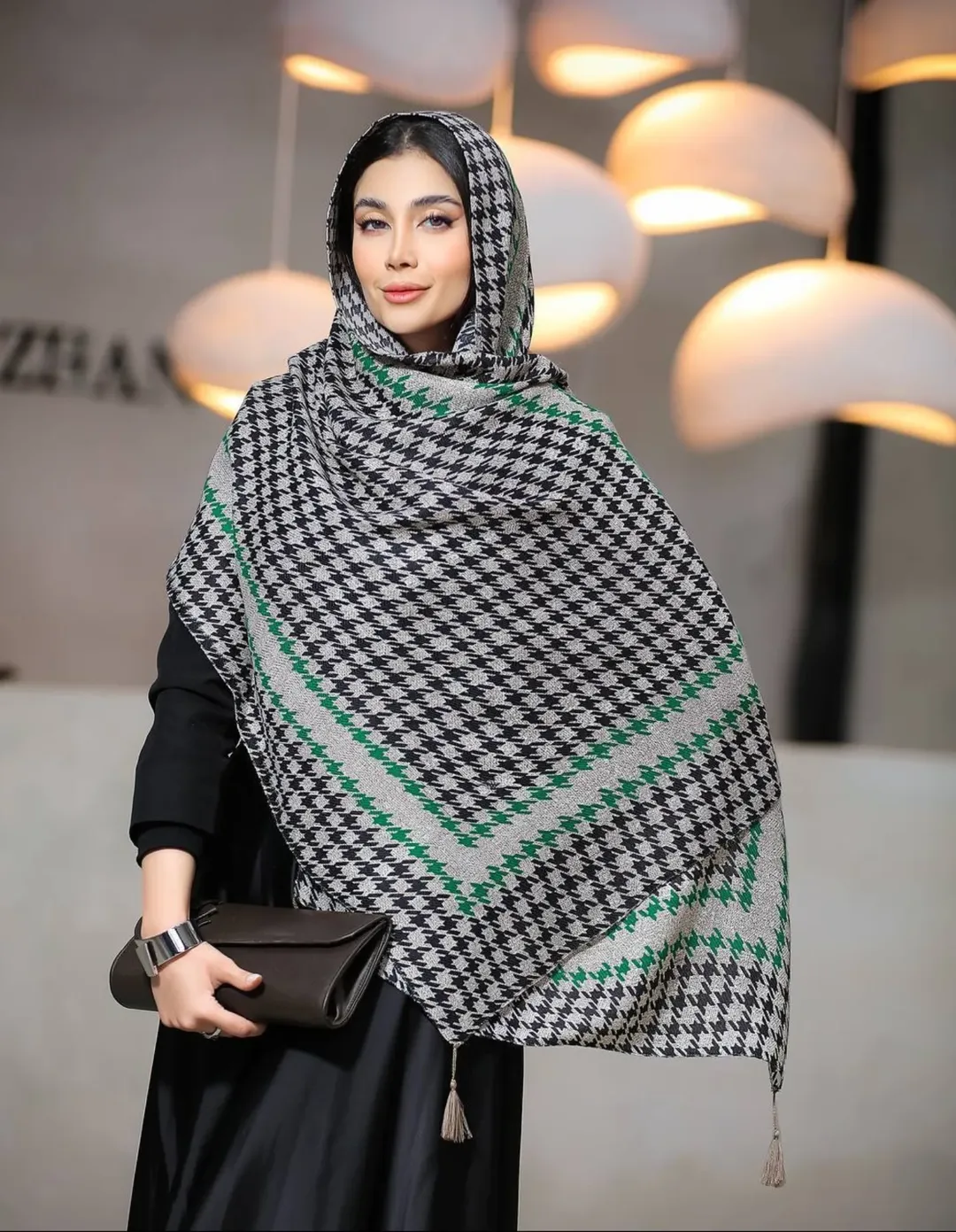 شال نخی پارچه جناقی پاییزه طرح پیچازی چهارطرف ریش